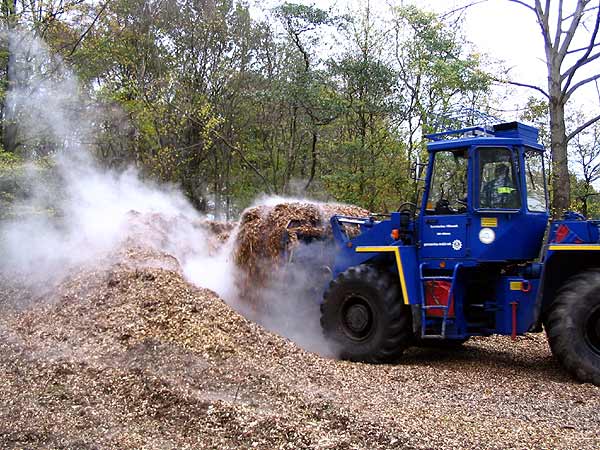 Nach ca. 40 Minuten war er vor Ort, da er nur ohne Sonderrechte fahren durfte. Der Radlader verteilte das Schreddergut auf dem Parkplatz und