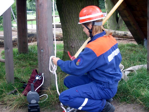 Unter den Augen der Prüfer mussten die Jugendlichen Knoten vorzeigen, an einer verletzten Person eine stabile Seitenlage vorführen, sowie Fragen zur Ersten Hilfe beantworten. Des Weiteren mussten die Jugendlichen einen Notruf absetzen können und allgemeine feuerwehrtechnische Fragen beantworten.