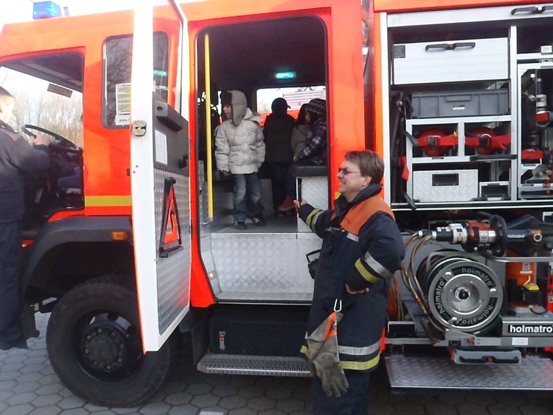 Wir waren mit mehreren Kameraden von 8 bis 11 Uhr am Feuerwehrhaus um der Kinderschar gerecht werden zu können. Wir hatten für die Kinder drei Stationen vorgesehen an denen sie Brandschutz und Verhalten im Notfall erklärt bekommen sollten. Zum einen wurde der Notruf, insbesondere die Notrufnummer der Feuerwehr 112, besprochen. Außerdem gab es natürlich die Möglichkeit unsere Fahrzeuge anzuschauen und zu erklimmen. Das Highlight für die Kinder war unsere vernebelte Fahrzeughalle in der die Kinder das Verhalten im Rauch lernen und einen Feuerwehrmann unter Atemschutz erleben konnten.