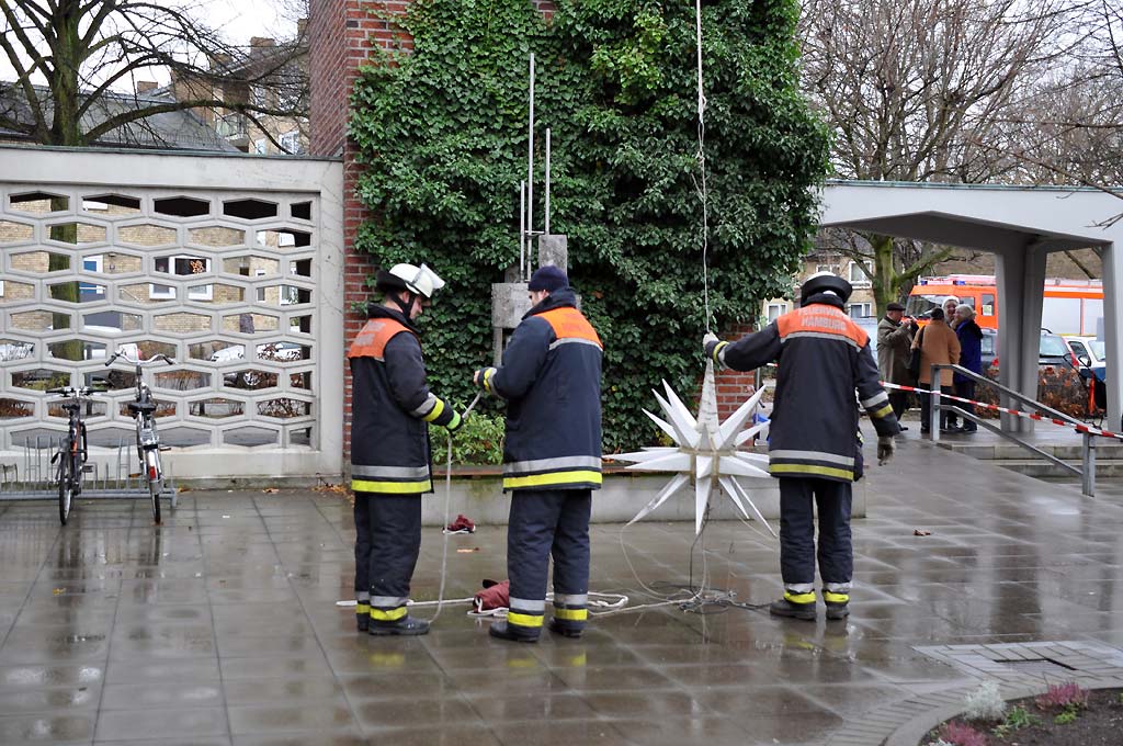 Am 30.11.2014, dem 1. Advent, machten sich die Kameraden der FF Öjendorf auf, um traditionell den Stern im Kirchturm der Jubilatekirche anzubringen. Pünktlich zum Ende des Gottesdienstes begannen wir den Stern außen am Turm hochzuziehen. Auch in diesem Jahr erschwerte leichter Wind das Unterfangen, doch durch die geübten Handgriffe und das Arbeiten Hand in Hand gelang es den Stern in kurzer Zeit zu installieren. Die Gemeinde beobachtete das Stern aufziehen und dankte es uns mit Wurst, Kuchen und Heißgetränken. Auch in diesem Winter leuchtet also der traditionelle Stern über Öjendorf.