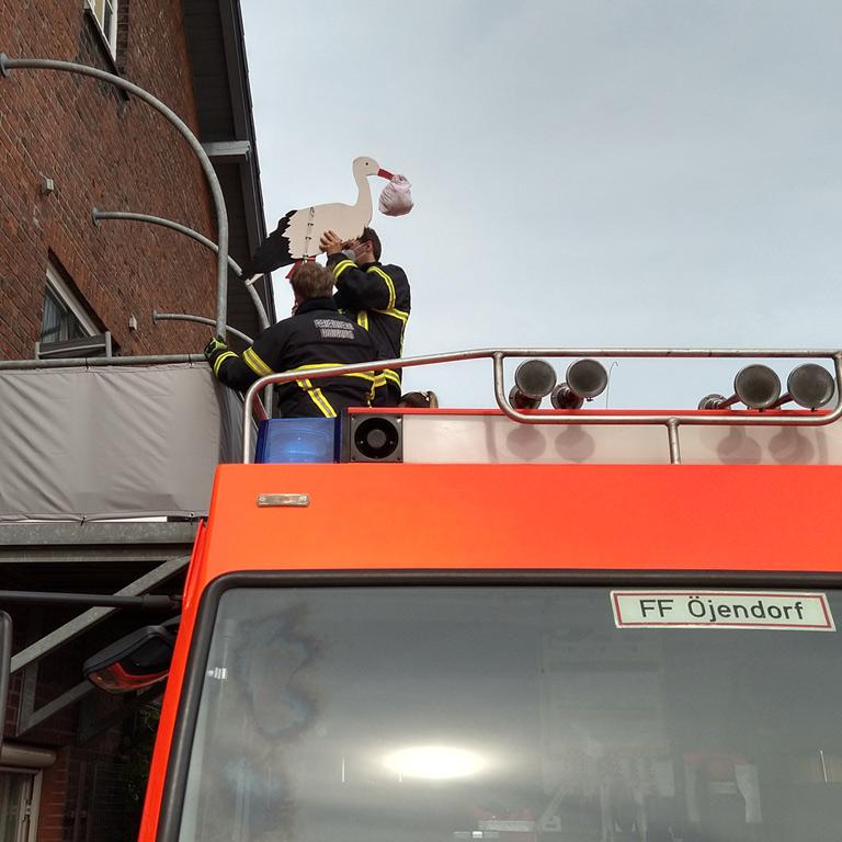 Wie in Öjendorf üblich, haben die Kameradinnen und Kameraden der Einsatzabteilung, zur Begrüßung der neuen Erdenbürgerin, den Storch aufgestellt.